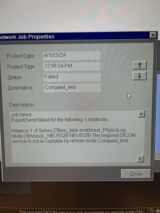 Our IT team has set the latest Conquest up and running. It is successfully receiving DICOM image files from our Siemens Prisma. However, we can't seem to send "special" DICOM files created by the CMRR multi-band EPI sequence that contain physio data logs (instead of image data). The message on the console states, "The required DICOM service is not acceptable by remote node Conquest". Is there a solution to this that I may convey to our IT group?